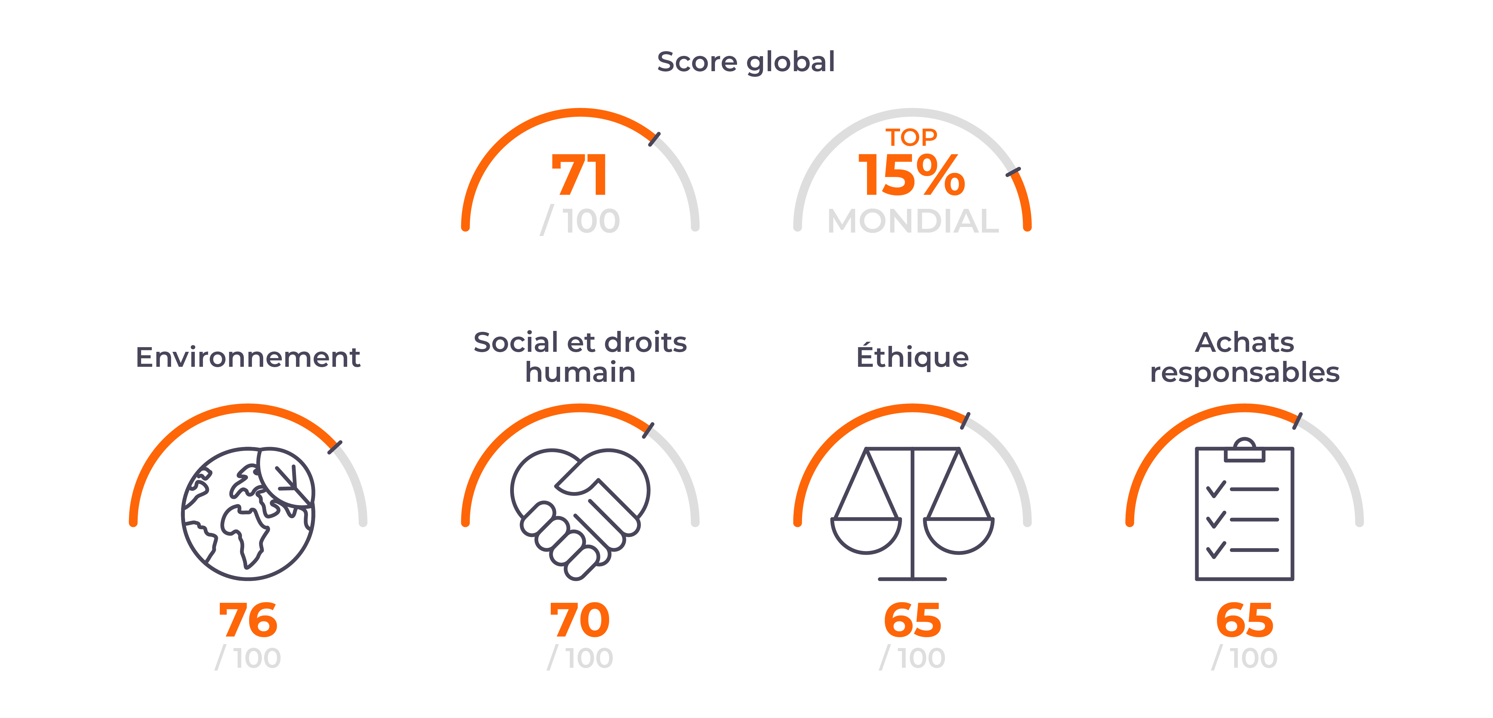 Pour 2025, Technima France a obtenu une note globale de 71/100, un très bon score qui lui permet d’obtenir la médaille d’argent et de rejoindre le top des fournisseurs engagés.